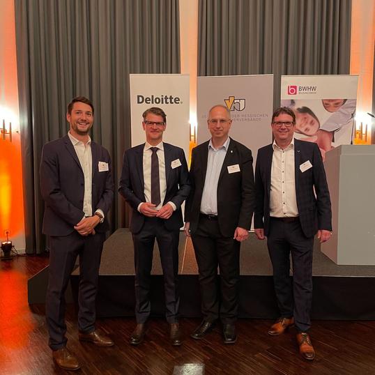 (v.l.n.r. Sven Rohde (Hauptgeschäftsführer Handelsverband Hessen e. V.), Dr. Stefan Höhl (Geschäftsführer Arbeitsmarkt- und Sozialpolitik der VhU), Yanki Pürsün (Mitglied des Landtages und Fraktionsvorsitzender der FDP-Fraktion im Frankfurter Römer), Jochen Ruths (Präsident Handelsverband Hessen e. V.)