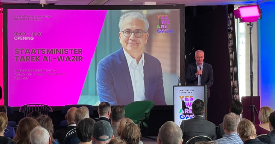 “YES, WE ARE OPEN!“ – unter diesem Motto eröffnete Wirtschaftsminister Tarek Al-Wazir am Freitag, 26. Mai den 6. Kreativwirtschaftstag im ehemaligen Esprit-Gebäude auf der Frankfurter Zeil.