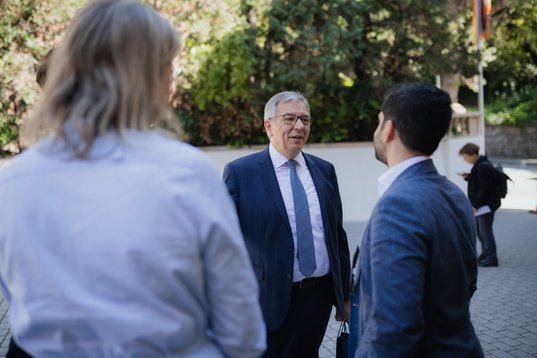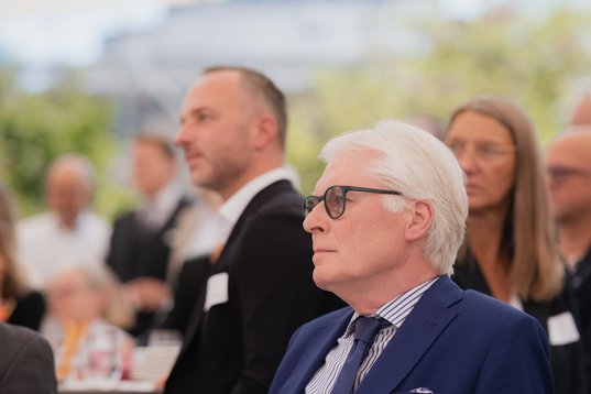 Gerald Kink als Hausherr und Präsident DEHOGA Hessen, sowie Tatjana Steinbrenner, Vizepräsidentin Handelsverband Hessen, begrüßten den Kanzler und die Ministerin im Garten des Hotel Oranien in Wiesbaden.