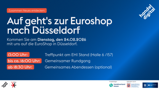 Besuchen Sie die EuroShop 2026, The World´s No. 1 Retail Trade Fair, vom 22. Februar bis 26. Februar 2026 in Düsseldorf. Wir haben eine begrenzte Anzahl an Eintrittskarten für Sie und bieten eine Führung zu den relevantesten Herstellern für die Bereiche "intelligente Preisschilder, Diebstahlprävention und Videoüberwachung" an. Den Abend lassen wir gemeinsam in der Düsseldorfer Altstadt ausklingen. Die EuroShop ist sowohl die weltweit wichtigste Investitionsgütermesse für den Handel und seine Partner, als auch eine unerlässliche Networking-Plattform für Zukunftstrends, Visionen und Retail-Impressionen zum Anfassen.