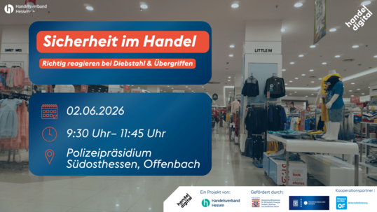 10:00 - 12:30 Uhr Heimathafen, WiesbadenPräsenzkostenfreiLadendiebstahl kostet den Handel Milliarden – und die Täter werden immer raffinierter. Wer nicht vorbereitet ist, riskiert finanzielle Verluste und gefährdet die Sicherheit von Mitarbeitenden sowie Kundinnen und Kunden. Doch wie erkennt man verdächtiges Verhalten rechtzeitig? Wie verhält man sich im Ernstfall richtig? Diese Veranstaltung gibt Ihnen das entscheidende Wissen, um Ihr Geschäft besser zu schützen. - 21April 2026, Di.handel.digital