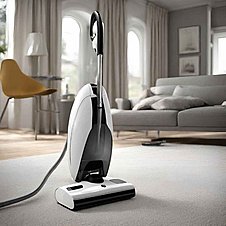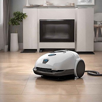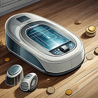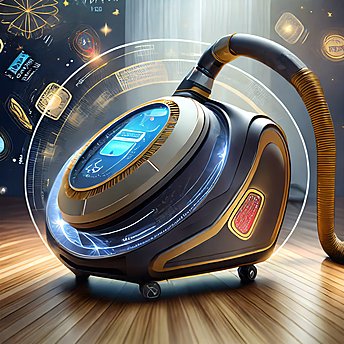"Erstelle ein hochauflösendes, realistisches Bild eines modernen, eleganten Staubsaugers für das Familienheim. Der Staubsauger namens 'Fantasy 3000' sollte ein futuristisches Design mit glatten Oberflächen und abgerundeten Kanten haben. Integriere eine digitale Anzeige, die intelligentes Sortieren symbolisiert, mit Icons für 'Staub', 'Knöpfe', 'Geld' und 'Spielzeug', die anzeigen, was aufgesaugt und was ausgespuckt wird. Die Farbpalette sollte fröhliche, aber nicht überwältigende Farben umfassen, um eine familienfreundliche Ästhetik zu vermitteln. Bitte füge sichtbare, aber ästhetisch ansprechende Sensoren hinzu, die für die Unterscheidung von Nützlichem und Unnützem zuständig sind. Der Staubsauger sollte auf einem sauberen, hellen Holzboden stehen, mit einigen Staubpartikeln, die aufgesaugt werden, und kleinen Gegenständen wie Münzen und Spielzeugfiguren, die neben ihm liegen, als würde er sie gerade aussortieren.”